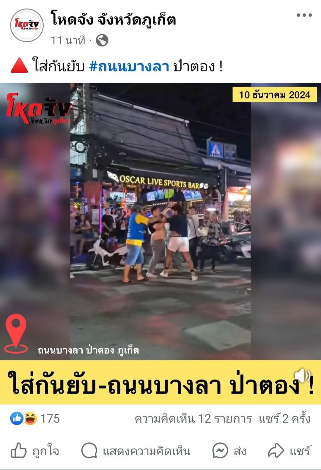เมื่อวันที่ 10 ธ.ค. ผู้สื่อข่าวรายงานว่า เพจเฟซบุ๊ก “โหดจัง จังหวัดภูเก็ต” ได้แชร์คลิปวิดีโอชายชาวต่างชาติชกต่อยกันเองความยาวคลิป 18 วินาที พร้อมระบุข้อความว่า ใส่กันยับ #ถนนบางลา ป่าตอง !